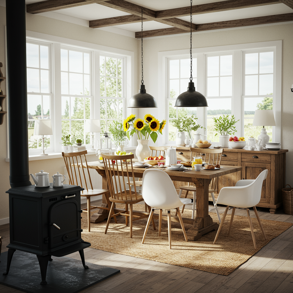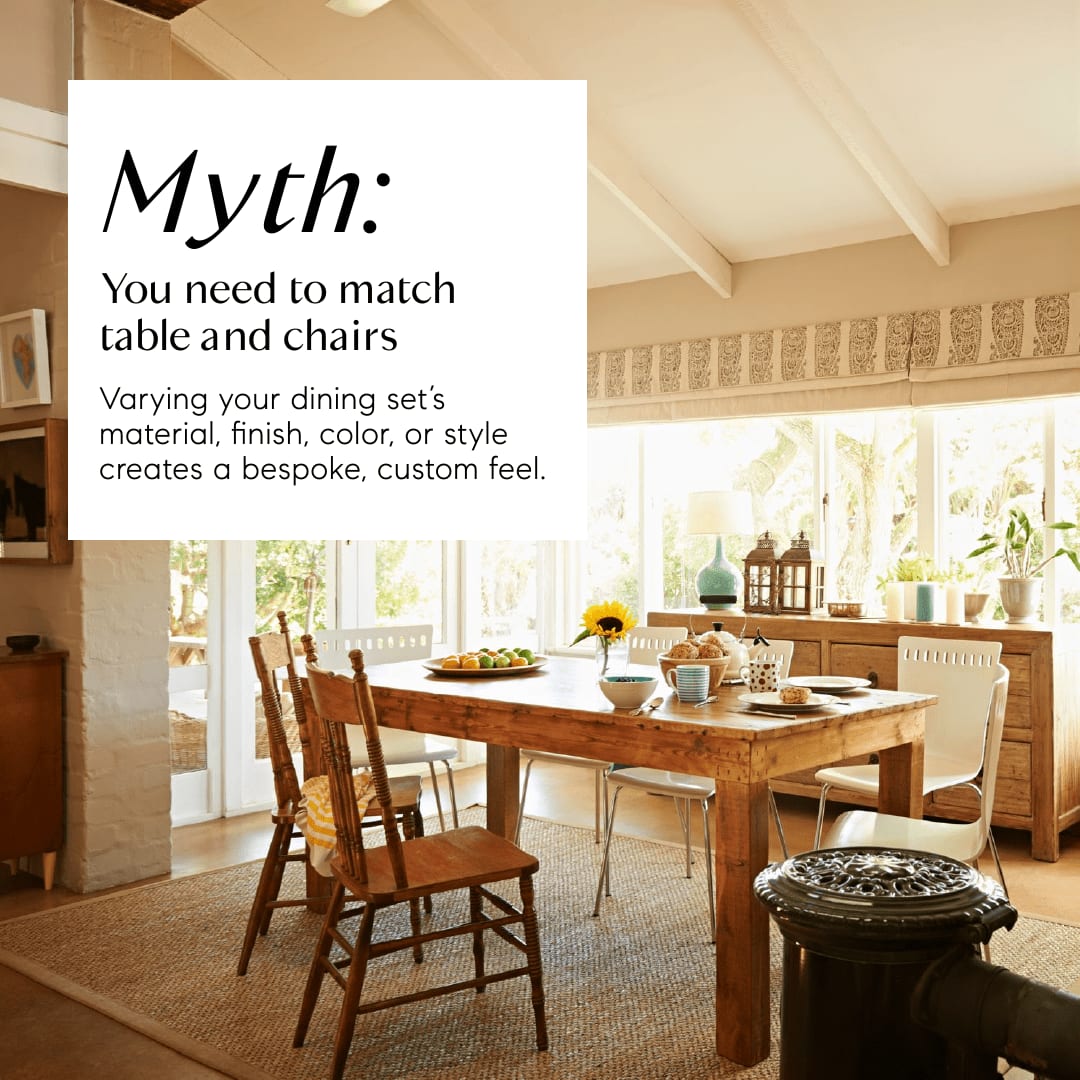 TIP: Mixing and matching your dining table and chairs adds personality and visual interest to your space. Instead of a uniform look, combining different styles, finishes, or materials can make the dining area feel more dynamic and unique. For example, pairing a wooden table with upholstered or metal chairs introduces texture and contrast, making the space feel curated and intentional. This approach gives your dining room a custom, designer feel without being overly formal or predictable
