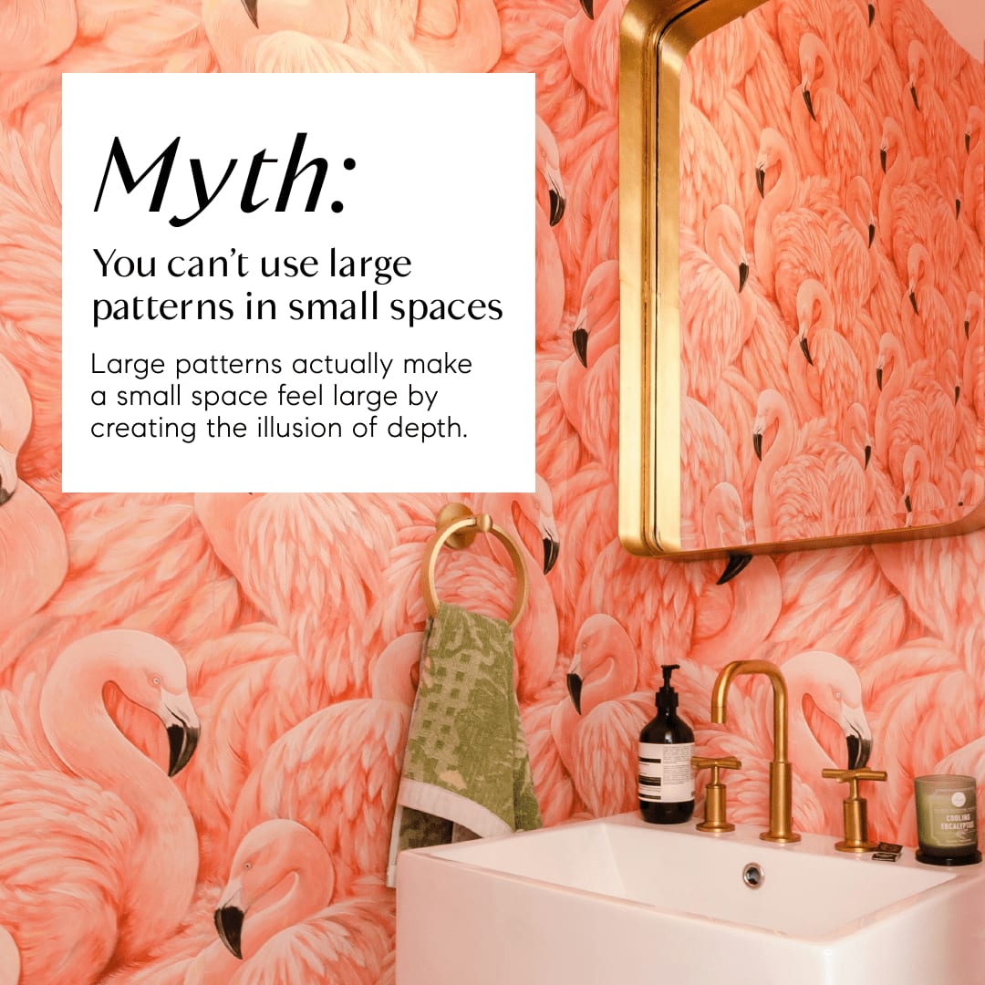 TIP: Contrary to popular belief, large patterns can be highly effective in small spaces. The bold shapes and expansive designs of large patterns draw the eye and create movement across the room, making it feel more dynamic and visually engaging. These patterns add a sense of depth and scale that tricks the eye into perceiving the space as larger than it really is. Whether used in wallpaper, rugs, or textiles, large patterns prevent the space from feeling cluttered or cramped, as their open, flowing design allows the room to feel more expansive and inviting. When used thoughtfully, they can also add character and personality, making the room feel both stylish and spacious.