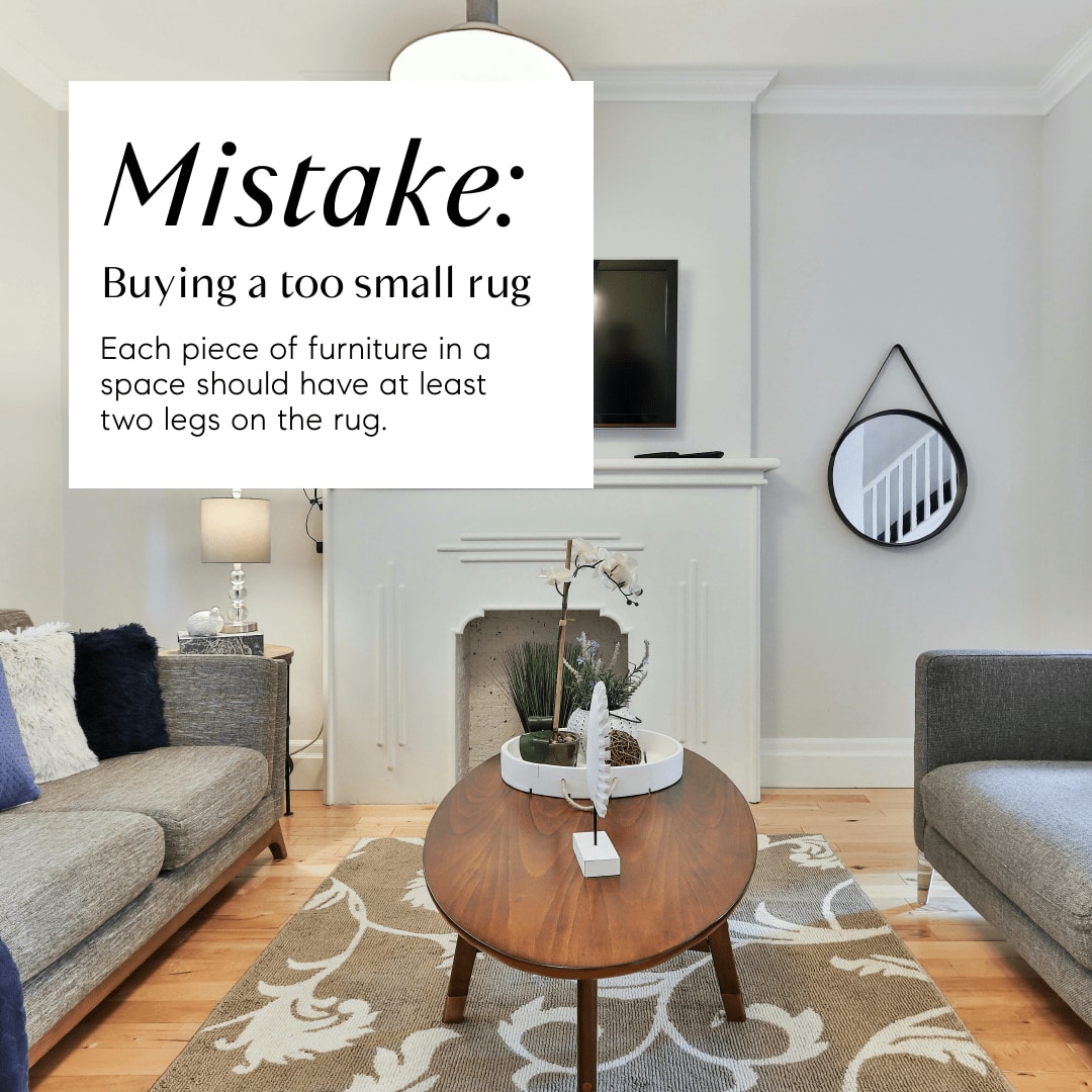 TIP: When selecting a rug, aim for one that’s large enough so that all the major furniture pieces in the room can have at least their front two legs resting on it. This simple guideline helps to tie the room together visually by creating a unified and grounded look. For example, in a living room, the front legs of your sofa, chairs, and coffee table should all sit on the rug. This ensures that the rug becomes a cohesive anchor for the furniture, establishing a well-proportioned and balanced space while adding warmth and texture.