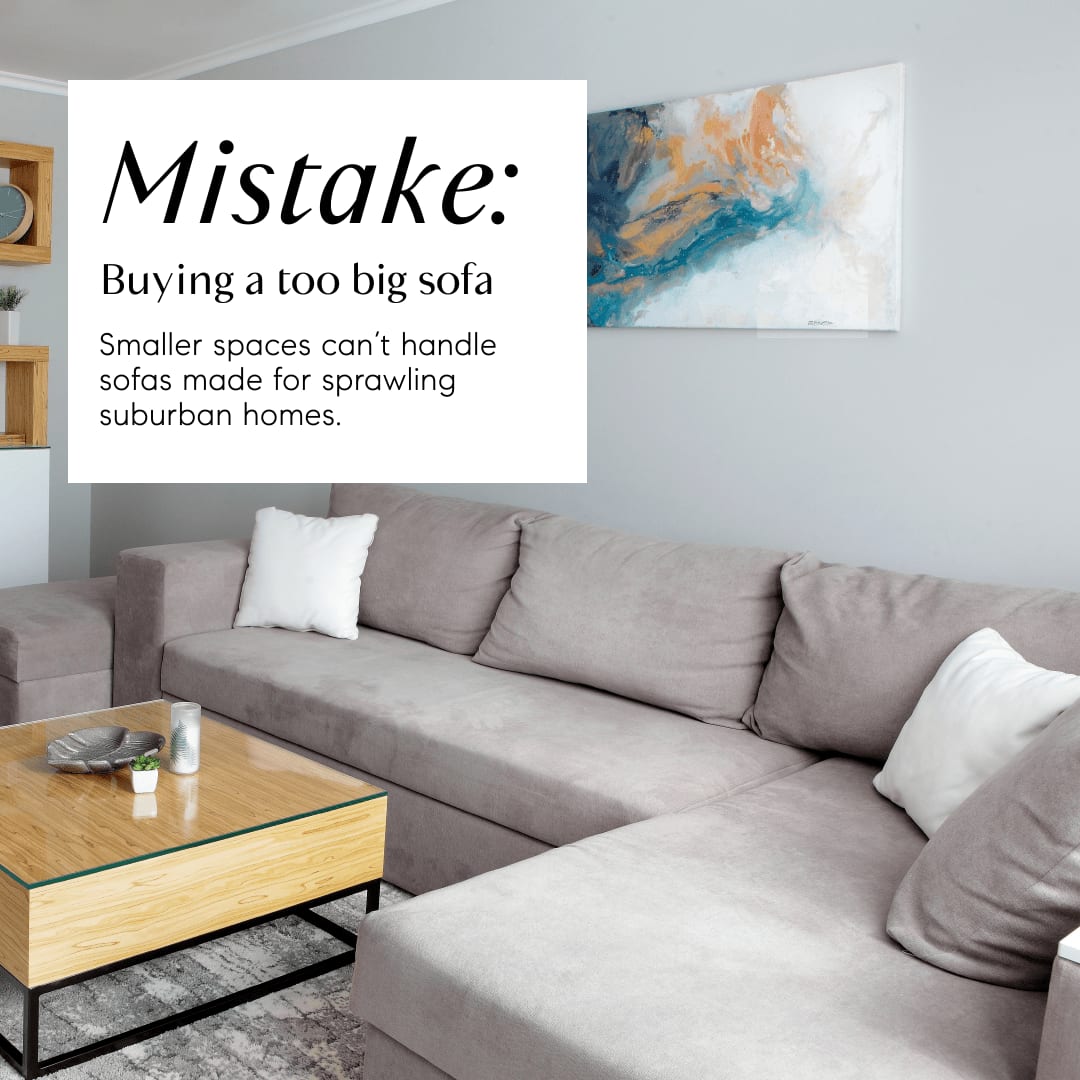 TIP: In small spaces, oversized sofas can overwhelm the room, making it feel cramped and unbalanced. Large, bulky furniture limits movement and reduces the functionality of the space. Instead, opt for a smaller, more streamlined sofa that fits the proportions of the room. Compact sofas or sectionals with slimmer arms and lower backs will provide comfort without dominating the space, helping the room feel open and inviting while still functional.