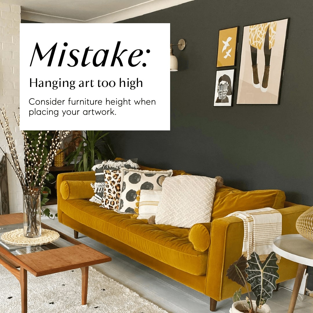 TIP: When hanging art, think about the height of the surrounding furniture. The general rule is that art should be centered at eye level, but that can vary depending on the space. If you’re hanging artwork above a couch, console, or bed, place it so that the bottom of the piece is 6-12 inches above the furniture. This will create a visual connection between the artwork and the furniture, making the space feel more balanced and intentional.
